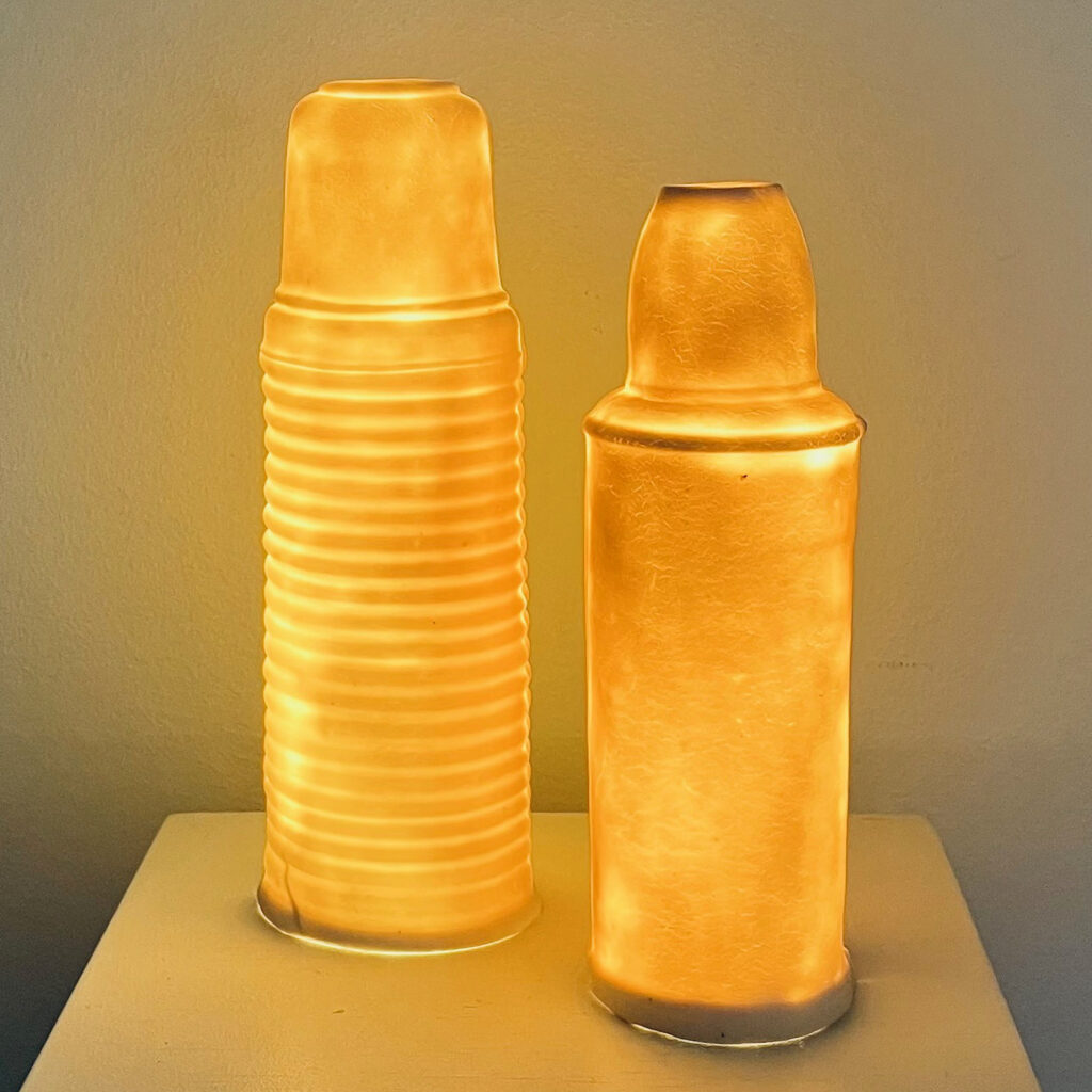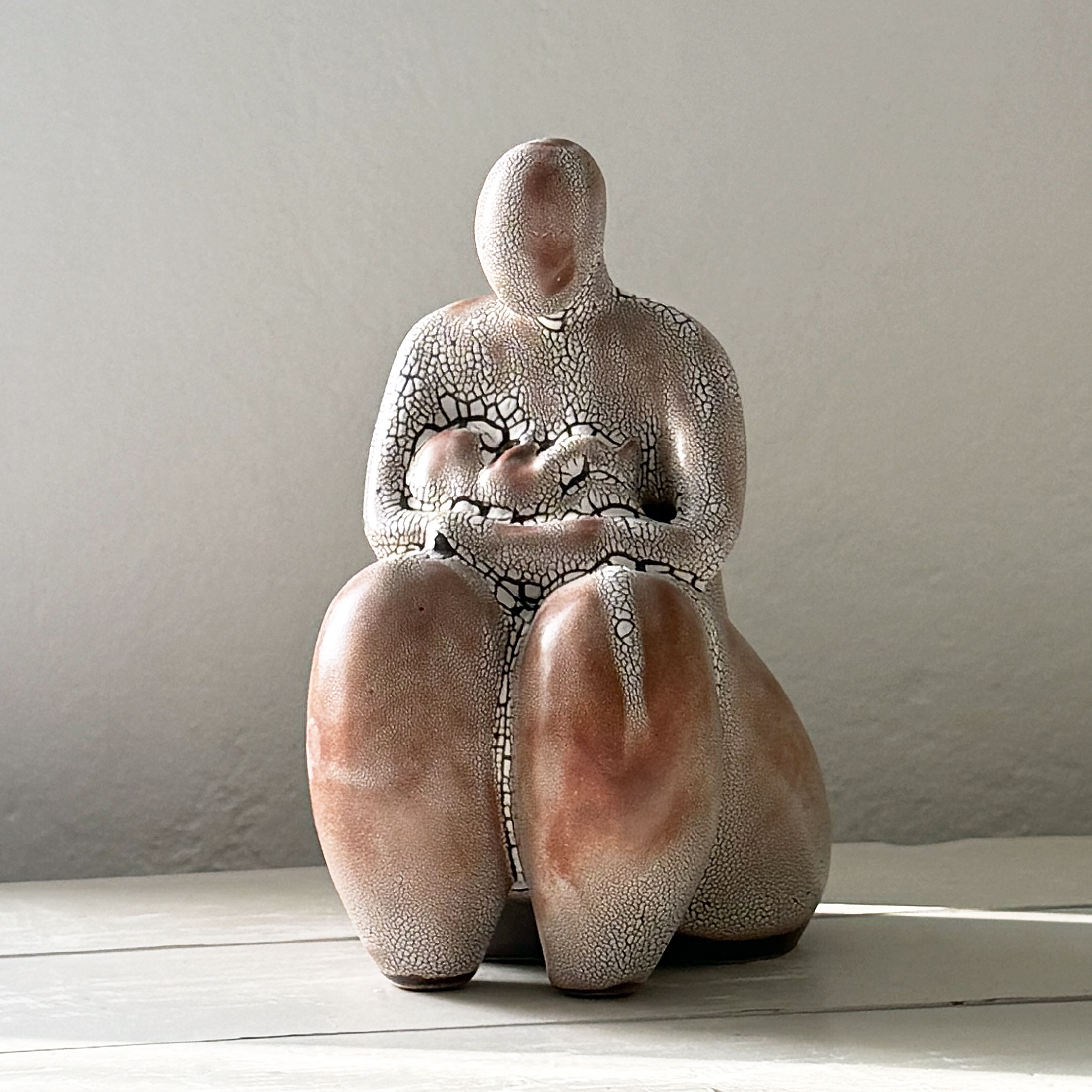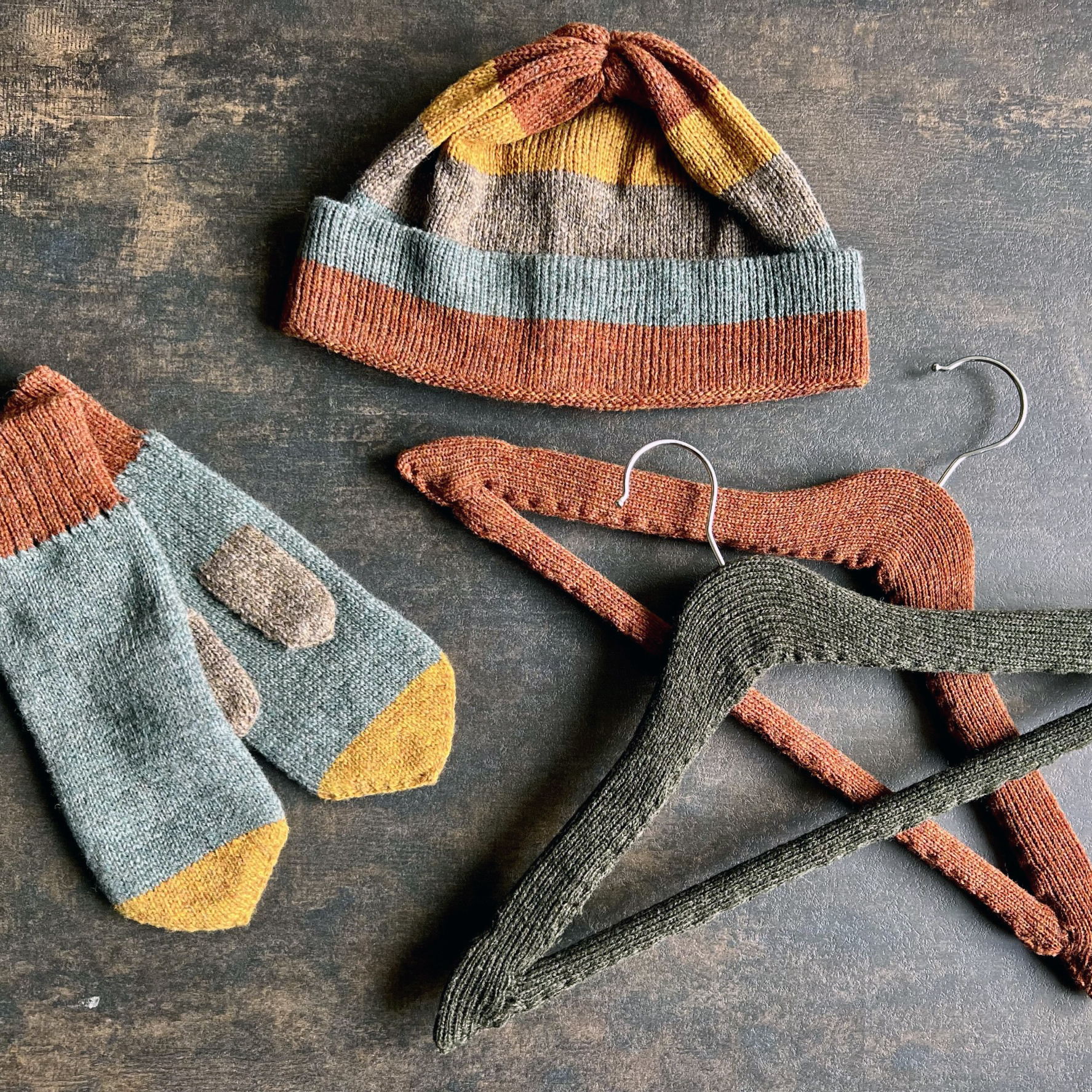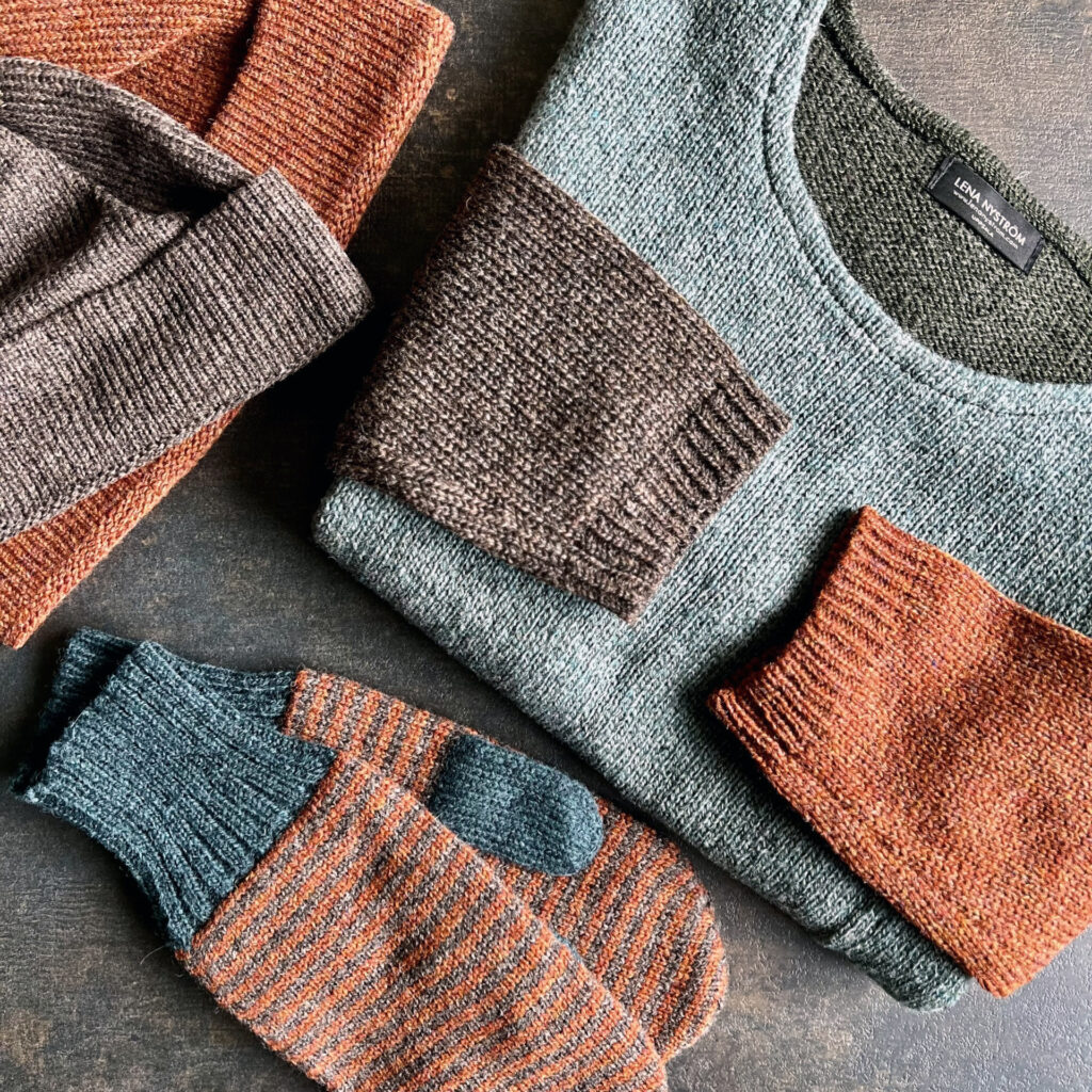 Lena, som är en av kooperativets medlemmar, ställer ut nya tröjor, mössor, vantar och sjalar i lammull. Även instickade galgar och nya skosnören till kängorna.